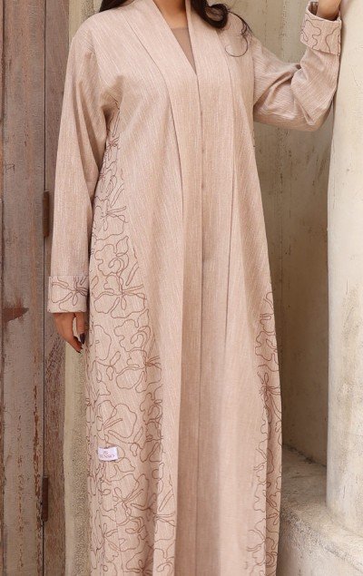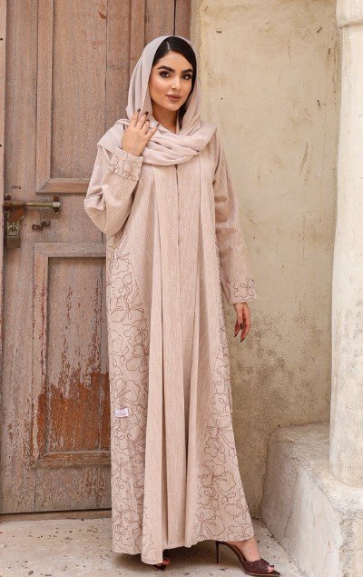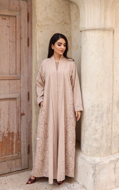 A winter abaya in a soft beige tone, featuring a practical yet refined design. Crafted from premium Turkish winter fabric, adorned with decorative threads that create a beautiful harmony while blending warmth with elegance. Paired with a matching sheila to complete your winter look with a touch of sophistication.